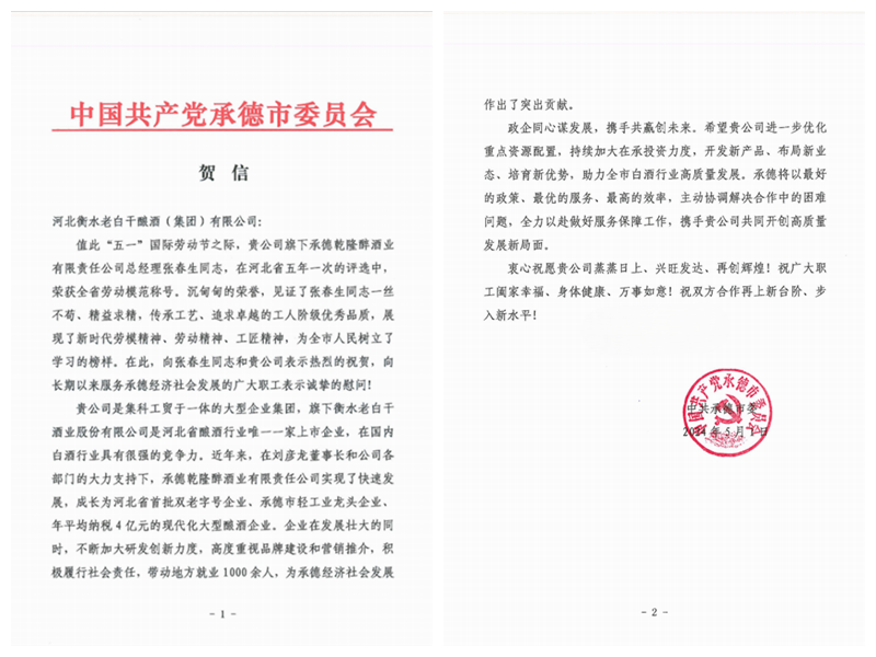 河北衡水老白干釀酒集團(tuán)收到一封來(lái)自承德市委的賀信,賀信主要內(nèi)容是對(duì)河北衡水老白干釀酒集團(tuán)子公司承德乾隆醉酒業(yè)(板城酒業(yè))黨委書(shū)記、總經(jīng)理張春生榮獲“全省勞動(dòng)模范”稱號(hào)表示祝賀。祝賀信中講到:“張春生同志一絲不茍、精益求精,傳承工藝、追求卓越的工人階級(jí)優(yōu)秀品質(zhì),展現(xiàn)了新時(shí)代勞模精神、勞動(dòng)精神、工匠精神,為全市人民樹(shù)立了榜樣,近年來(lái),企業(yè)在發(fā)展壯大的同時(shí),不斷加大研發(fā)創(chuàng)新力度,高度重視品牌建設(shè)和營(yíng)銷推介,積極履行社會(huì)責(zé)任,帶動(dòng)地方就業(yè)1000余人,為承德經(jīng)濟(jì)社會(huì)發(fā)展作出了突出貢獻(xiàn)。”張春生作為制造業(yè)(工業(yè)領(lǐng)域)的翹楚,先后獲省“三三三人才工程”人選、河北省企業(yè)家協(xié)會(huì)先進(jìn)工作者、河北省食品行業(yè)年度人物、中國(guó)商業(yè)聯(lián)合會(huì)科學(xué)技術(shù)獎(jiǎng)、全國(guó)商業(yè)科技進(jìn)步獎(jiǎng)-特等獎(jiǎng)、2020年與2022年度分別榮獲河北省優(yōu)秀民營(yíng)企業(yè)家等多項(xiàng)榮譽(yù)。