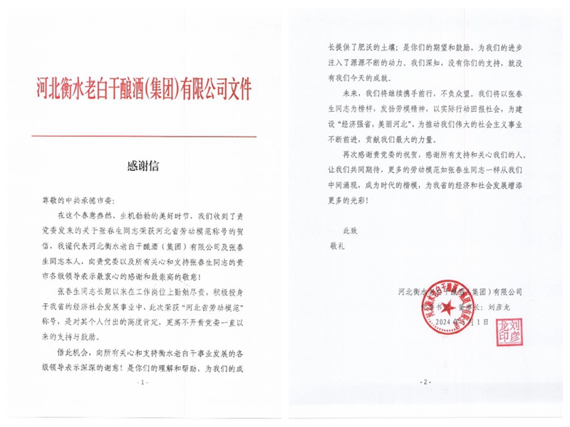 河北老白干釀酒集團(tuán)在感謝信中寫(xiě)到:“張春生同志長(zhǎng)期以來(lái)在工作崗位上勤勉盡責(zé),積極投身于我省的經(jīng)濟(jì)社會(huì)發(fā)展事業(yè)之中,此次榮獲河北省勞動(dòng)模范,是對(duì)其個(gè)人付出的高度肯定,更離不開(kāi)承德市黨委一直以來(lái)的支持與鼓勵(lì)。我們將以張春生同志為榜樣,發(fā)揚(yáng)勞模精神,以實(shí)際行動(dòng)回報(bào)社會(huì),為建設(shè)經(jīng)濟(jì)強(qiáng)省,美麗河北,貢獻(xiàn)我們最大的力量”。