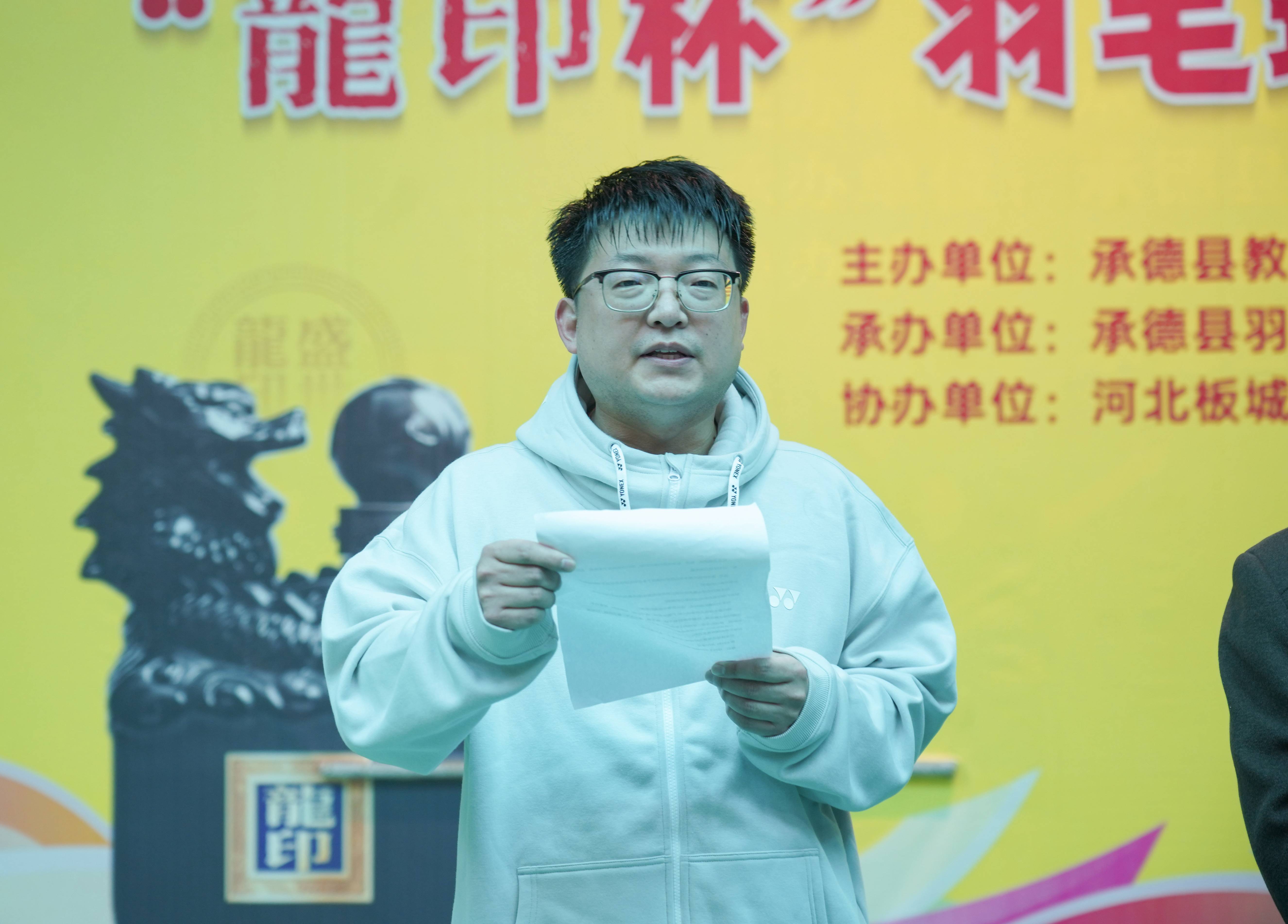 承德縣教育和體育局黨組成員朱瑞東首先進行致辭,他表示承德縣教育和體育局積極響應(yīng)全民健身號召,開展了形式多樣的體育活動,羽毛球是一項深受大家喜愛的運動項目,通過舉辦此次賽事,增強了大家體育意識,發(fā)揚體育精神,有效推動承德縣的體育事業(yè)發(fā)展,希望各參賽人員充分發(fā)揮“團結(jié)友愛,奮勇拼搏”的精神,賽出好成績。